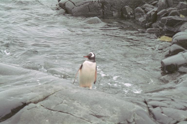 The landing area was very low, and there was water on all sides with just a narrow path of rocks up to higher ground. The water on the far side of the landing area was enclosed from the surrounding way somewhat, and was filled with ice floating on the surface in large chunks. There were penguins swimming in the water and hopping in at one end and jumping onto the rocks at the other. They would line up at one end and then either jump in or turn around and go back onto the higher rocks.